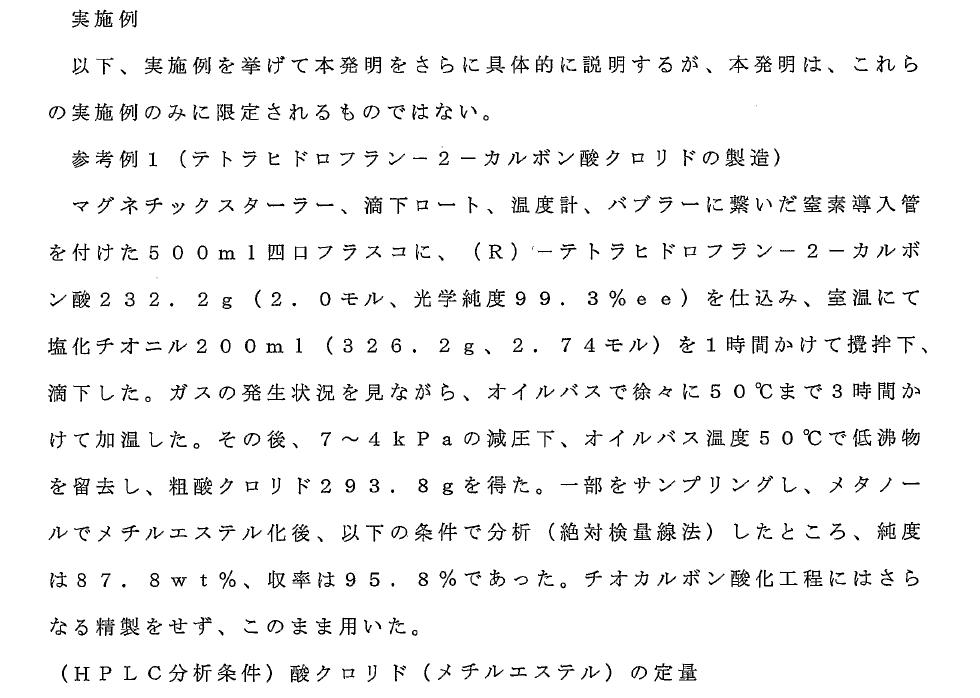 以下,列举实施步骤对本发明给予进一步具体说明,本发明并不仅限于这些实验步骤。参考例1(tetrahydrofuran-2-carboxylic acid chloride 的制造) 连接带有有搅拌机,滴定漏斗,温度计,带有起泡器(气体以小细泡的形式进入液体的装置)的氮气导入管的500ml四口烧瓶,加入(R)-tetrahydrofuran-2-carboxylic acid 232.2g(2.0mol,光学纯度99.3%ee),在温室下将200ml的亚酰硫二氯(thionyl chloride)(326.2g,2.74mol)边搅拌边滴定一个小时。一边观察气泡产生状况,在恒温油槽中缓慢加热至50度加热3个小时。之后,7-4kpa减压下,恒温油槽内的温度为50度时减压蒸馏出去低沸物,得到粗tetrahydrofuran-2-carboxylic acid chloride 293.8g.取一部分做样本,用甲醇甲酯化,通过以下条件分析(绝对检量线法),纯度为87.8wt%,收率为95.8%。可不用硫代羧酸化工程进一步精制便可使用。 (HPLC分析条件)tetrahydrofuran-2-carboxylic acid chloride (甲酯 methyl ester)的定量 |