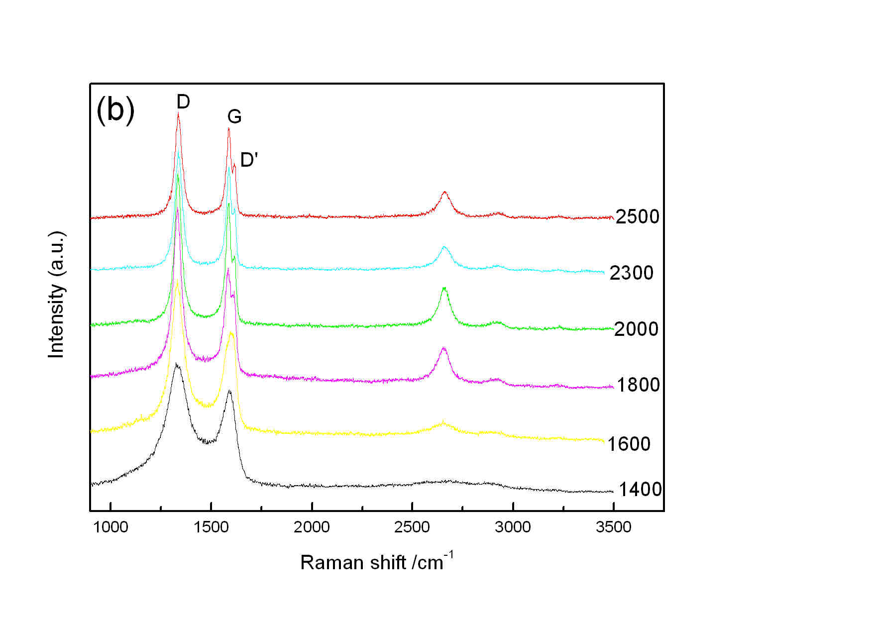 b. 将用硼酸浸泡过的炭纤维炭纤维在一系列温度下高温石墨化,再对各温度下炭纤维的表面进行拉曼光谱分析。