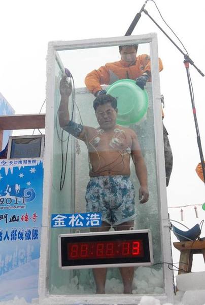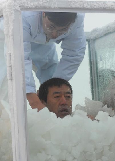 Jin Songhao, one of the two Chinese icemen braving cold in a box full of ice cubes, prepares to start his challenge on Tianmen mountain in Zhangjiajie, Central China's Hunan province, Jan 3, 2011. Jin Songhao and Chen Kecai, both from Northeast China's Heilongjiang province, only in swimsuits, broke the record Monday set by "The Ice Man" Wim Hof from the Netherlands by submerging in ice cubes for 118 minutes and 120 minutes. A doctor checks up Chen Kecai braving cold in a box full of ice cubes on Tianmen mountain in Zhangjiajie, Central China's Hunan province, Jan 3, 2011. Chen Kecai and Jin Songhao, two Chinese icemen, braves cold in a box full of ice cubes on Tianmen mountain in Zhangjiajie, Central China's Hunan province, Jan 3, 2011. Chen Kecai, one of the two Chinese icemen, braves cold in a box full of ice cubes on Tianmen mountain in Zhangjiajie, Central China's Hunan province, Jan 3, 2011. |