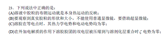 A严格意义也不对的,布朗运动是热运动的特例 B胶体的粒径是在1-100nm之间的,所以是普通的显微镜(最小是200nm)是达不到这个效果的,以及观察期热力学运动规律,就必须用超显微镜(《物理化学 》傅献彩 第五版 p417 p427), C等电点是,只是说交胶体粒子的净电荷为零,并不说明胶体粒子里面没有电荷,如果胶体上电荷,所以热力学电势与电动势均不为零 D是错的的,《物理化学 》傅献彩 第五版 p435最下面的一行,原文是这样说的,“当双电层被压缩到与溶剂化层叠合时,电动电势即fai电势可以降到以零位为极限”,而不是绝对的为零 严格来说,无正确答案 |