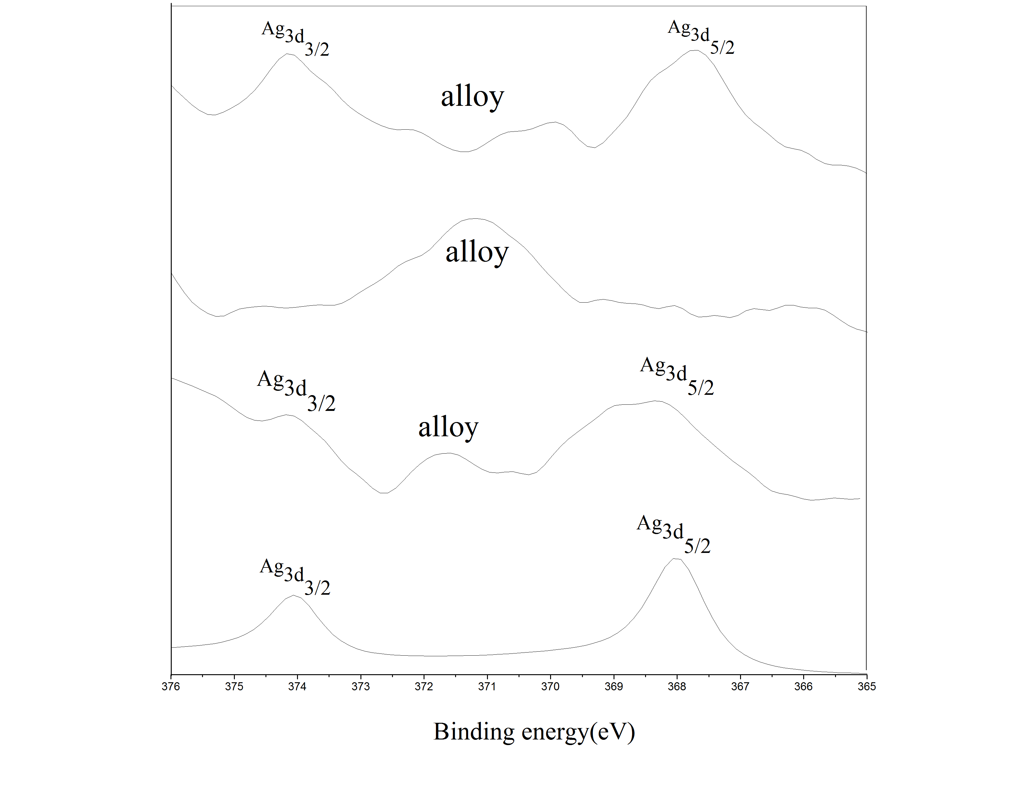 处的新峰,其他Ag3d5/2和 Ag3d3/2 峰不见了,何解?拟合的问题还是出现了合金的新峰呢?求高人指教!