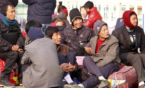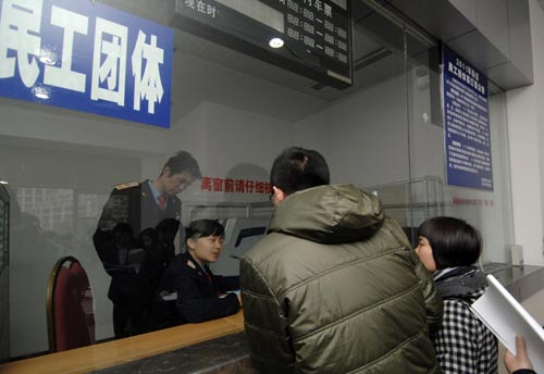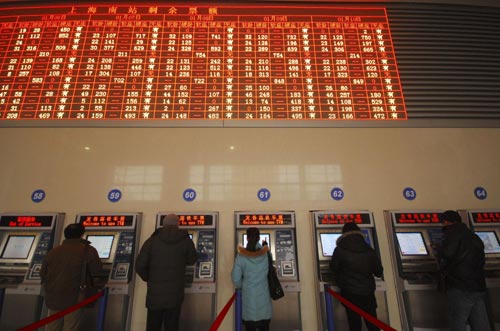 People trying to buy a ticket home crowd the railway ticket hall of Xi'an Railway Station in Xi'an, Northwest China's Shaanxi province, Jan 5, 2011. Although the peak travel time for Chinese railway doesn't start until Jan 19 this year, people who're eager to get a seat on the train have already started their struggles. During the 40-day Spring Festival travel rush, from Jan 19 to Feb 27, about 230 million trips are expected on Chinese railways, 5.75 million a day. Lunar New Year, or Spring Festival, which starts on Feb 3 this year, is China's biggest holiday, during which people return home to be with family. People buy railway tickets from automatic vending machines at Shanghai Railway Station in Shanghai, Jan 5, 2011. Migrant workers wait for trains at Changzhou Railway Station in Changzhou, East China's Jiangsu province, Jan 4, 2011. People from companies that employ large numbers of migrant workers book group tickets for them at Hangzhou Railway Station in Hangzhou, East China's Zhejiang province, Jan 5, 2011. A woman from Zhejiang University of Technology shows tickets she bought for students, at Hangzhou Railway Station in Hangzhou, East China's Zhejiang province, Jan 5, 2011. |