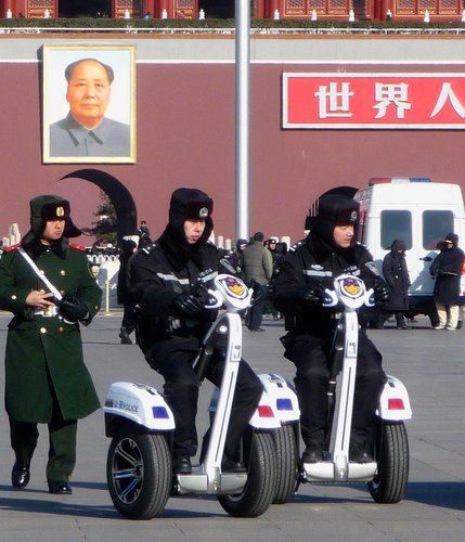 Policemen ride through the Tian'anmen Square in Beijing on Jan 5, 2011. The so-called "intelligent police vehicle," equipped with a camera, can run up to 20 kilometers per hour, which is equivalent to jogging speed. Being small and convenient, the vehicle can easily help police patrol among crowded and tight places. Whether it will become an official police vehicle is still under discussion. Policemen ride through the Tian'anmen Square in Beijing on Jan 5, 2011. Policemen ride through the Tian'anmen Square in Beijing on Jan 5, 2011. |