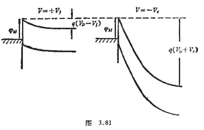额。。。通常是N掺杂的费米能级比金属的低,P掺杂的费米能级比金属的高(通常),造成金属和N型半导体接触时半导体能带向上弯曲;而金属和P半导体接触时,半导体能带向下弯曲。接触时两者费米能级相等。功函大小我是说可以测得的,也可以计算得到。![]() 至于热发射的问题它是与平衡状态比较的,肖特基势垒在平衡时,从金属到半导体热发射的电子与半导体到金属热发射的电子相等,是净电流为0的一个动态过程。当金属-N半导体接正向电压时,半导体一侧电子移向半导体表面受到的势垒减小,热发射几率增大,平衡被打破,造成半导体热发射到金属一侧的电子多于金属热发射到半导体一侧的电子,显示为金属到半导体的净电流,随着正向偏压增大,界面处电子浓度成指数级增长。而接反向电流时,半导体一侧电子移向半导体表面受到的势垒增大,热发射的几率减小,平衡被打破,造成金属热发射到半导体一侧的电子比半导体发射到金属一侧的电子多,显示为半导体到金属的净电流,但是这个电流和金属侧的势垒有关系(可近似看做只与金属的功函有关系),与所加偏压大小没有多大联系(以上都有理论计算的),表现为电流饱和。 ![]() 你是把金属一侧的势垒和半导体表面的势垒混为一谈了,见图。φm是金属一侧的势垒,q(VD-Vf)是正向偏压时半导体一侧的势垒,q(VD+Vr)是加反向偏压时半导体一侧电子从体相移动到表面处所受的势垒。 ![]() 类似于PN结啦,接正向偏压时电流随电压增大而显著增大;接反向偏压时,电流基本饱和,不随偏压变化。 ![]() 具体请参考黄老的《半导体物理基础》1979版198页半导体-金属接触这一节 ![]() ![]() [ Last edited by 鹰羽龙 on 2011-3-31 at 18:08 ] |