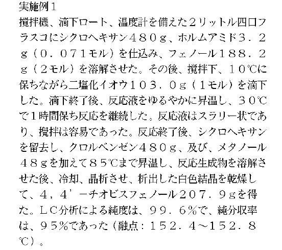 | 搅拌机,滴定漏斗,温度计装在2L四口烧瓶上,在该烧瓶里装入环己烷(cyclohexane)480g,甲酰胺(formamide)3.2g(0.071mol),用苯酚188.2g(2mol)溶解。之后,搅拌,温度保持在10度的同时滴入二氯化硫(Sulfur DiChloride)103.0g(1mol).滴定结束后,缓缓加热反应液,在30度继续反应1个小时。反应液处于泥浆状,搅拌变得容易。反应结束后,蒸馏除去环己烷(cyclohexane),加入氯苯(chlorbenzene)480g 以及甲醇(methanol)48g并升温至85度,溶解反应生成物后,冷却,结晶。干燥所析出的白色结晶,得到4,4'-二羟基二苯硫醚(4,4'-Thiobis-phenol)。经过LC分析,纯度为99.6%,纯分收率为95%(融点:152.4~152.8度) |