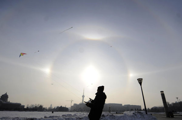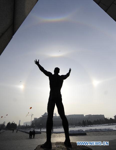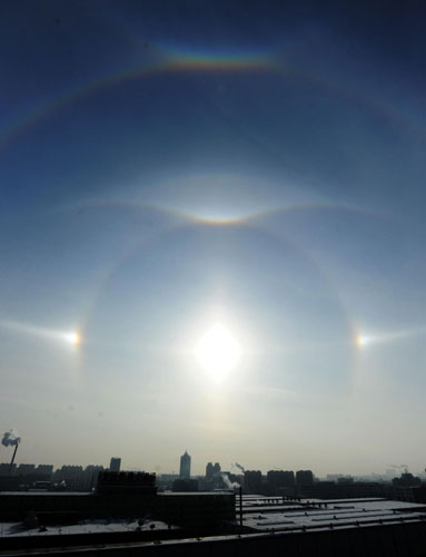 A parhelion (also known as sundog) combined with a halo is seen in Changchun, capital of Northeast China's Jilin province, Jan 8, 2011. The atmospheric phenomenon is created by ice crystals in the air at low levels during a cold weather period. A parhelion (also known as sundog) combined with a halo is seen in Changchun, capital of Northeast China's Jilin province, Jan 8, 2011. A parhelion (also known as sundog) combined with a halo is seen in Changchun, capital of Northeast China's Jilin province, Jan 8, 2011. A parhelion (also known as sundog) combined with a halo is seen in Changchun, capital of Northeast China's Jilin province, Jan 8, 2011. |