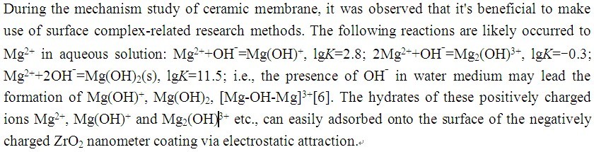 就质量作用定律的表达形式,表面络合只是比液相内的络合作用多了一个静电项e-ZFФ/RT,式中Ks为表观常数,Kint为表面电荷为0时的固有表面常数,Ф为表面电位,Z为离子电荷,F为法拉第常数,R为气体常数,T为绝对温度。在陶瓷膜的机理研究中,本研究注意到有必要使用表面络合物的相关研究方法。Mg2+在水溶液中可能发生如下反应:Mg2++OH- Mg(OH) 。 Mg2+可与介质水中的OH-形成Mg(OH)+,带正电的Mg2+(H2O等可通过水合物的形式以静电方式吸附在带负电的ZrO2纳米涂层表面。 |