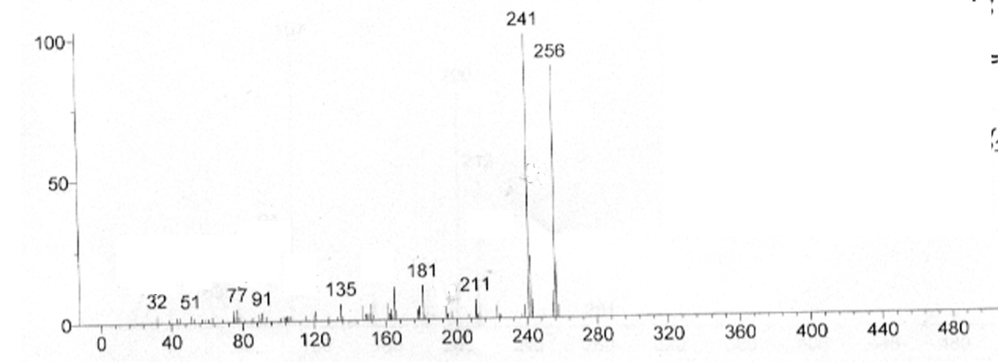 m/z: 256, 241, 211, 181, 135, 91, 77, 51, 32