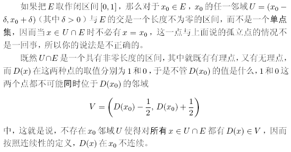 如果按定义,对任意一x0(x0属于E),都可以在x0邻域U内找到一x属于E且属于U,必有x=x0,此时D(x)=D(x0)。 则D(x)在任意x0上都连续,即D(x)在E(E=[0,1])上连续。