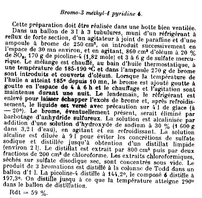 向装有回流冷凝器、搅拌、涂蜡250ml滴溴漏斗3L三口瓶中,在30分钟,依次加入,860ml发烟硫酸(20%),170克4-皮考啉(1.82mol)和3-6克硫酸汞,用油浴加热混 合物,温度在185-190度,滴加270克溴,油温维持在185度,滴加时间4-6小时,加热、搅拌过夜,次日,撤去冷凝器,有过量溴,冷却,倒入4L冰中,可能有溴存在,通过鼓入二氧化硫除去溴,在搅拌,冷却下加入30%碱溶液,(1 600克加入3.2L水)防止析出硫酸钠固体,碱溶液稀释到9L,蒸馏直到馏分透明(大约2L),用氯彷萃取蒸出馏分二次,每800ml使用200ml氯彷,氯彷用硫酸钠干燥,然后减压浓缩,3-溴产物在装有精馏柱烧瓶中精馏,4-皮考啉,144.2度,组分6 197.3度,精馏至烧瓶温度达到290度。