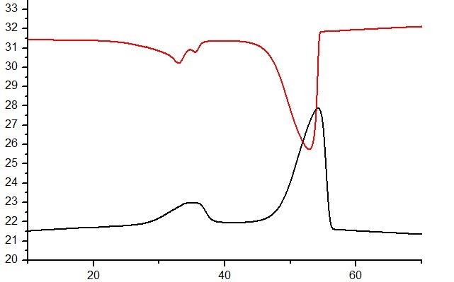 本人感觉还是要相信升温曲线的,另外纵坐标不那么重要吧,热分析不就是要看吸热峰放热峰判断相变等,对应的横坐标才是重点。不知降温曲线是不是程序控温,好像不是吧,因此才有50多度峰的位置不一致。