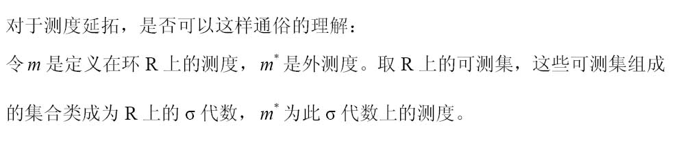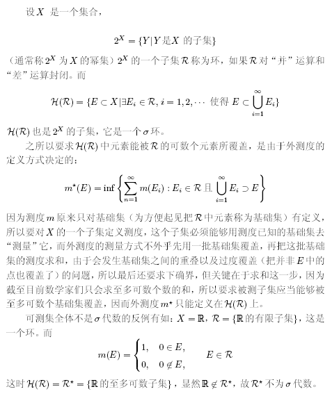m* 是定义在 H(R)上的,其中 H(R) 是可被 R 中至多可数个元素覆盖的子集全体,H(R)中满足卡拉氏(Caratheodory)条件的元素称为可测集,m*在可测集全体 R*——这是一个σ环,但不一定是σ代数——上的限制成为 R*上的测度。