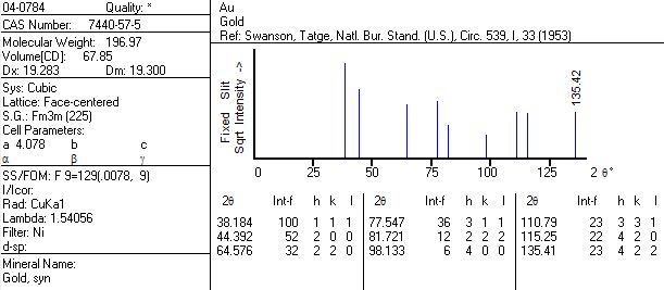 Name and formula Reference code: 04-0784 Mineral name: Gold, syn PDF index name: Gold Empirical formula: Au Chemical formula: Au Crystallographic parameters Crystal system: Cubic Space group: Fm-3m Space group number: 225 a (Å : 4.0786 b (Å : 4.0786 c (Å : 4.0786 Alpha (°): 90.0000 Beta (°): 90.0000 Gamma (°): 90.0000 Calculated density: 19.30 Measured density: 19.30 Volume of cell: 67.85 Z: 4.00 RIR: - Subfiles and Quality Subfiles: Inorganic Mineral Alloy, metal or intermetalic Common Phase Educational pattern Forensic NBS pattern Quality: Star (S) Comments Color: Yellow metallic General comments: Opaque mineral optical data on specimen from unspecified locality: RR2Re=71.6, Disp.=16, VHN100=53-58, Color values=.384, .391, 72.7, Ref.: IMA Commission on Ore Microscopy QDF. Sample source: Sample purified at NBS, Gaithersburg, Maryland, USA and is about 99.997% Au. Analysis: Spectrographic analysis (%): Si 0.001, Ca 0.001, Ag 0.001(?). Optical data: B=0.366 Melting point: 1061.6-1063.2 Temperature: Pattern taken at 26 C. References Primary reference: Swanson, Tatge., Natl. Bur. Stand. (U.S.), Circ. 539, I, 33, (1953) Optical data: Winchell., Elements of Optical Mineralogy, 17 Peak list No. h k l d [A] I [%] 1 1 1 1 2.35500 100.0 2 2 0 0 2.03900 52.0 3 2 2 0 1.44200 32.0 4 3 1 1 1.23000 36.0 5 2 2 2 1.17740 12.0 6 4 0 0 1.01960 6.0 7 3 3 1 0.93580 23.0 8 4 2 0 0.91200 22.0 9 4 2 2 0.83250 23.0 |