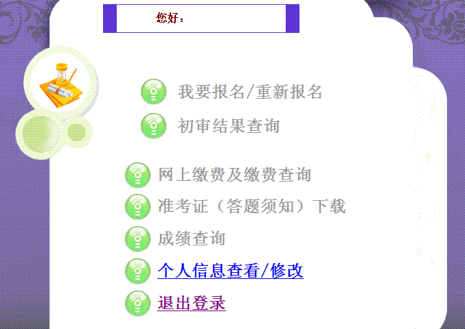 现在登录 怎么查不到初审结果呢 先前有一个 状态“审查中”的 现在登录见图 除了最后的“修改个人资料”和“退出” 都没有反应。 “我要报名” “初审结果查询” 都没有显示 是审核通过了还是咋地呢 求助一下 图片挂不上来~只能这样描述了 |