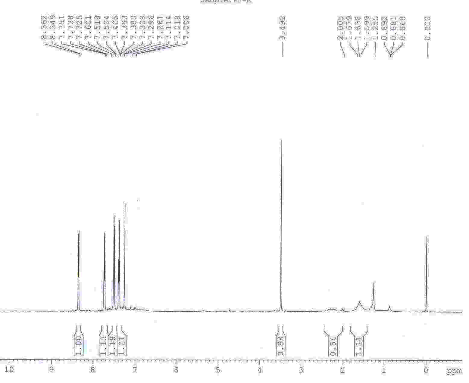 3.49ppm确实是甲醇的峰, 但是苯环部分实在太诡异了, 建议确定是否300M的核磁,很怀疑,觉得应该不是300M的核磁,而是600M的,看下面的一个谱图,如果是300M的话,应该下面一个谱图也没有苯环,但是明显高场区有连在苯环上的甲基,甲氧基。另外,如果下面一个图也没有苯环,真的没办法说了。 如果是300M的核磁,化合物结构应该不简单,要么做其他谱图来看看,要么等做类似工作的人来看吧。 [ Last edited by louluv on 2011-1-19 at 11:28 ] |