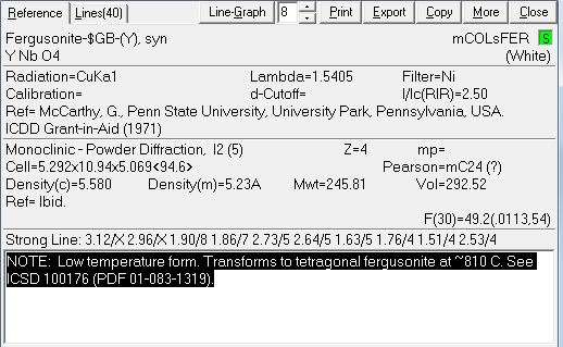 *data for ICSD #100176 Coll Code 100176 Rec Date 1980/12/31 Mod Date 2007/08/01 Chem Name Yttrium Niobate Structured Y (Nb O4) Sum Nb1 O4 Y1 ANX ABX4 Min Name Fergusonite-beta (Y) D(calc) 5.5 Title Kristallstrukturverfeinerungen von Euxenit, Y (Nb0.5 Ti0.5)2 O6 und m- Fergusonit, Y Nb O4 Author(s) Weitzel, H.;Schroecke, H. Reference Zeitschrift fuer Kristallographie (149,1979-) (1980), 152, 69-82 Phase Transition (1992), 38, 127-220 Unit Cell 7.6454(3) 10.9994(5) 5.3172(2) 90. 138.42 90. Vol 296.76 Z 4 Space Group C 1 2/c 1 SG Number 15 Cryst Sys monoclinic Pearson mS24 Wyckoff f2 e2 R Value .018 Red Cell C 5.089 5.317 6.536 112.086 110.931 94.527 148.379 Trans Red -1.000 0.000 -1.000 / 0.000 0.000 -1.000 / 0.500 -0.500 1.000 Comments In setting I2/c: beta'=94.5?, a'=5.090, z'=z-x Stable up to 1093 K (2nd ref., Tomaszewski), above 4/m AE: Yb: 8ap O8; Nb: O4; O1,2: Yb2 Nb Compound with mineral name: Fergusonite-beta (Y) Neutron diffraction (powder) The structure has been assigned a PDF number (calculated powder diffraction data): 01-083-1319 The structure has been assigned a PDF number (experimental powder diffraction data): 23-1486 Structure type prototype : YNbO4(mS) Structure type : YNbO4(mS) Atom # OX SITE x y z SOF H ITF(B) Y 1 +3 4 e 0 0.3763(1) 0.25 1. 0 0.45(2) Nb 1 +5 4 e 0 0.8578(1) 0.25 1. 0 0.57(3) O 1 -2 8 f 0.2117(3) 0.7818(1) 0.2145(4) 1. 0 0.49(2) O 2 -2 8 f 0.2477(2) 0.9599(1) 0.6533(3) 1. 0 0.31(2) *end for ICSD #100176 |