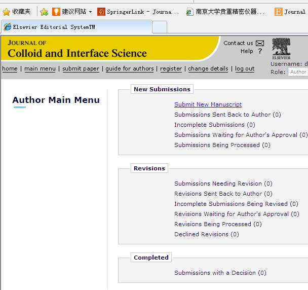 昨天在Journal of Colloid and Interface Science上投了一篇文章,且已经投稿成功。当我今天在自己电脑上登录进入Author Main Menu界面时,结果Submissions Being Processed上显示为0,而我老板的电脑上却显示为1,表明有一篇文章正在处理。请问这是怎么回事,现在我的电脑上看不到文章的状态很是着急,请大侠指点。