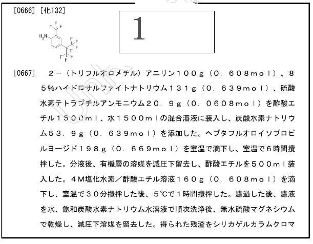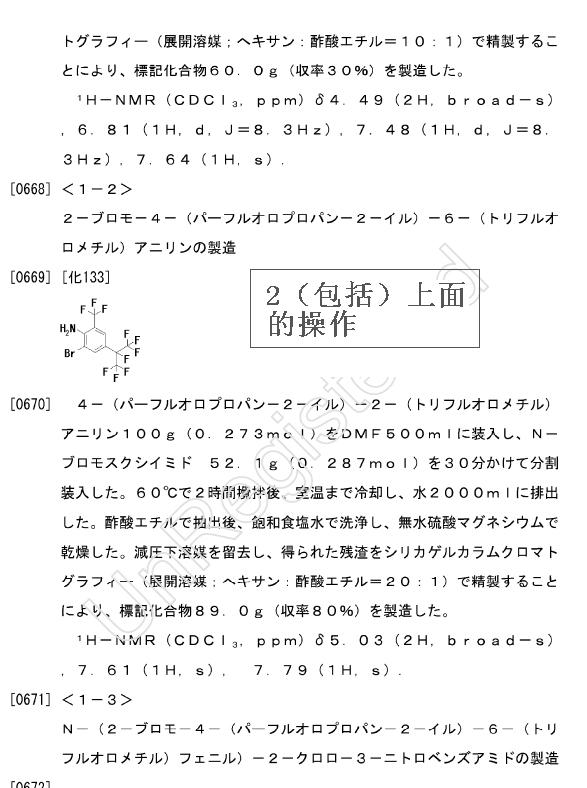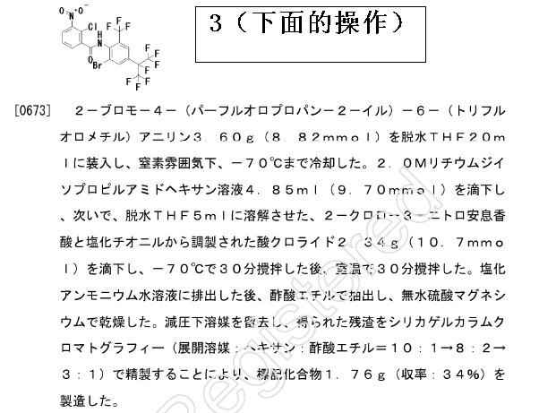 楼上的就是用机子翻译的效果,保险粉是神马 将邻氨基三氟甲苯{2-(trifluoromethyl)anline} 100g(0.608mol),85%的次硫酸钠131g(0.639mol),四丁基硫酸氢铵 20.9g(0.0608mol)溶于1500ml乙酸乙酯,1500水中。添加53.9g(0.639mol)碳酸氢钠。在室温下滴入七氟异丙碘 (Heptafluoroisopropyl iodide)198g(0.669mol).室温下搅拌6个小时。分液后,加压蒸去有机层的溶剂,加入500ml的乙酸乙酯。滴入4M 盐酸/乙酸乙酯 溶液160g(0.608mol),室温下搅拌30分钟,然后在5度下搅拌1小时。过滤后,用水,半盒碳酸氢钠水溶液依次清洗滤液,用无水硫酸镁干燥。减压出去溶剂。得到的残渣用硅胶柱层析法(展开溶剂 已烷:乙酸乙酯=10:1) 精制获得标记化合物60.0g(收率30%)。 谱不写了 [0668]<1-2> 2- bromo-4-( perfluoropropane-2-yl)6-(trifluoromethyl)aniline 的制造 【0669】<化133>(2包括上面的操作) 将4-(perfluoropropane-2-yl)-2-(trifluoromethyl)aniline 100g(0.273mol)装入500ml DMF中,再用30分钟的时间分次装入52.1g(0.287mol) 的 NBS(N-Bromosuccinimide){这里说的含糊,不知是说用30分钟的时间依次装入DMF,NBS还是单指30分钟分次装入NBS,但好像后者可能性更大写,仅作参考)。60度搅拌2小时后,冷却至室温,将其导入到2000ml的水中。用乙酸乙酯提取后,用饱和食盐水洗净,用无水硫酸镁干燥。减压蒸去溶剂,用硅胶柱层析法精制得到的残渣(展开溶剂 已烷:乙酸乙酯=20:1)。获得标记化合物89.0g(收率80%) 谱不写了 【0671】<1-3> N-(2-bromo-4-(perfluoropropane-2-yl)-6—(trifluoromethyl)aniline)-2-chloro-3-nitrobenzamide 的制造 【0673】 将2-bromo-4-(perfluoropropane-2-yl)-6—(trifluoromethyl)aniline 3.60g(8.82mmol) 装入20ml 的脱水THF中,氮气环境下,冷却至-70度,滴入2.0M lithium diisopropylamide hexane 溶液4.85ml (9.70mmol),接下来,用脱水THF5ml 溶解,再用2-氯(chloro)-3-硝基(nitro) 安息香酸与亚硫酰二氯(thionyl chloride)调制得到的氯化物 2.34g(10.7mmol)进行滴定,在-70度下搅拌30分钟后,再在室温下搅拌30分钟。将其导至氯化铵水溶液中,用乙酸乙酯提取,用无水硫酸镁干燥,减压除去溶剂,用硅胶层析法(展开溶剂 已烷:乙酸乙酯=10:1→8:2→3:1)得到的残渣精制获得标记化合物1.76g(收率34%) |