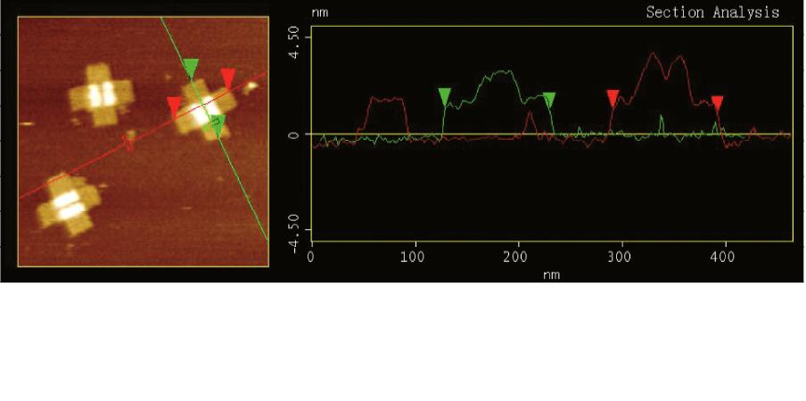 你这是一个很有意思的纳米结构,像两根纳米带叠加成的十字架 你这是AFM的section(截面)图,右边的红色和绿色的线表示的是左边形貌图中对应的两条线的截面。 纵坐标表示的是高度坐标,横坐标是长度方向的坐标。 这个图应该还有一部分数据没有显示出来,绿色的数据表示的是绿线上两个箭头之间的数据,包括高度差,水平距离和表面距离等。红色的数据表示的是红线的数据。 你这次测试没有给出十字架的高度数据,建议你拿原始数据处理一下。 |