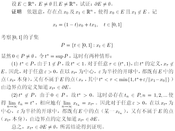 如下图所示,但若E 为一开集,则其边界点一定为空,与下图命题矛盾?!请大虾赐教!