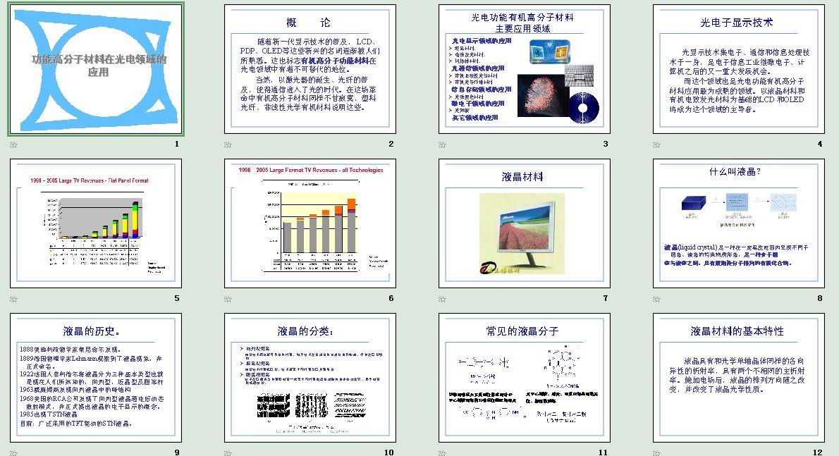 随着新一代显示技术的普及, LCD、PDP、OLED等这些新兴的名词逐渐被人们所熟悉。这也标志有机高分子功能材料在光电领域中有着不可替代的地位。 当然,以激光器的诞生、光纤的普及,使得通信进入了光的时代。在这场革命中有机高分子材料同样不甘寂寞,塑料光纤、非线性光学有机材料说明这些。 下载地址: https://u.115.com/file/f24674eb5# 有机高分子材料在光电中的应用.ppt [ Last edited by 梅若鸣 on 2011-1-26 at 11:13 ] |