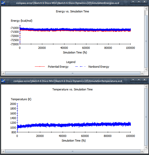 我用MS软件中的discover跑动力学,跑了100ps,最后出来的能量曲线和温度曲线如下图,从图可以看出温度和能量已经几乎不变了,看来体系已经平衡了,但是为什么能量却变大了,不是应该能量最低状态才是平衡态吗?而且温度下降了。好奇怪的现象,希望大家帮忙解释一下原因吧,谢了。 |