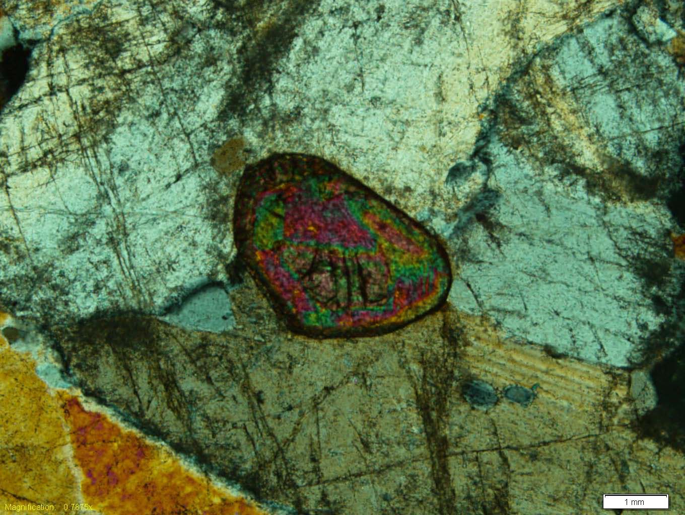 十分感谢大家,我询问了一些人,并参考了一些发表的薄片,才明白,这个矿物我们很熟悉,是锆石。