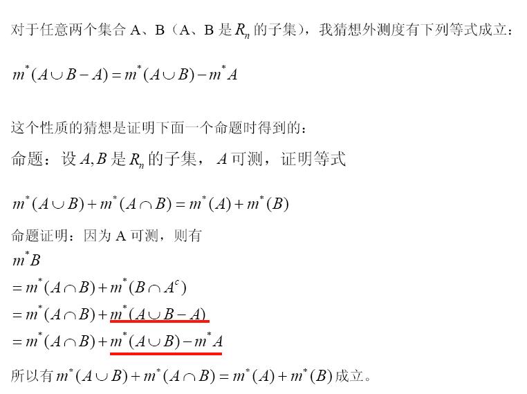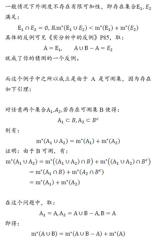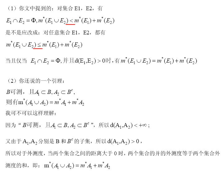 把d(A,B)>0当做m*(A并B)=m*(A)+m*(B)成立的充分条件来理解(在R^n中对Lebesgue外测度),我认为偏离了数学本质.