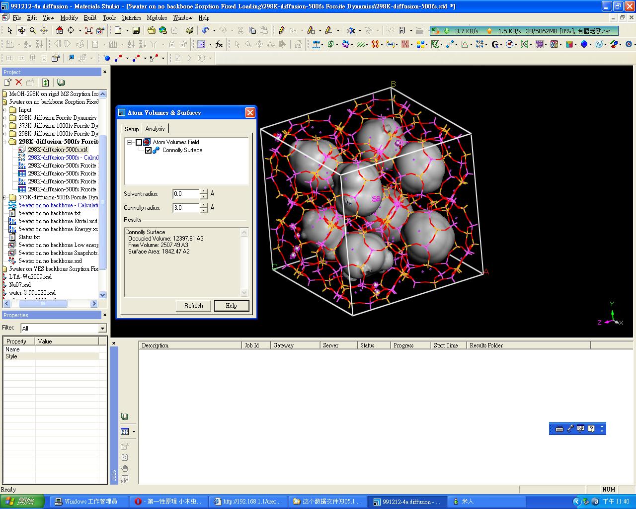 我想驗證一般脫水用3A分子篩,對水(2.8A)及酒精(4.0A)之孔洞選擇性是否真如一般宣稱分子篩孔洞為3A?但用MS工具卻連2.8A也無法將孔洞連接,是否說明水分無法在內部進行擴散?那又如何選擇性吸附水分。