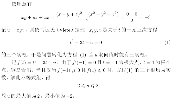 我用大学数学做做吧, 引入两个拉格朗日乘子:L1和L2,构造 F = xyz + L1*(x+y+z)+ L2*(x^2+y^2+z^2 -6) 对F分别对x,y,z求导令其为0可得 yz +2*L2 * x + L1 =0 (1) xz + 2*L2 *y +L1 =0 (2) xy+2*L2*z +L1 =0 (3) 三式相加并反复利用x+y+z=0可得 xy+xz+yz + 3*L1+ 2*L2*(x+y+z) =0 => xy + z( x+y) +3*L1=0 => xy - z^2 +3*L1 =0 (4) (3)-(4)得 z^2 +2*L2 *Z - 2*L1 =0 (5) => z^2 = 2*L1 -2*L2 *z 对x,y,z有同样的结论,由x^2+y^2+z^2 =6=> 6* L1 =6 => L1=1 由(5)可以解得 z or y or x = - L2 +(-) sqrt ( L2^2 +1 ) 由x+y+z=0可知x,y,z不可能都相等,但只能取其2根之一,比如x,y不相等,则 x+y+z = -2* L2 +z =0 此时z只能为-L2+ (-) sqrt (L2^2+2), 所以有 9*L2^2 = L2^2 +1 => L2 = + (-) 1/2 代回去可得 L2= 1/2时 xyz =-2*L1 *z = -2 当L2 =-1/2时,xyz =-2*L1 *z =2 嗯好像比楼上的方法要繁琐很多啊, 罪过,不过不用用到韦达定理了。 |