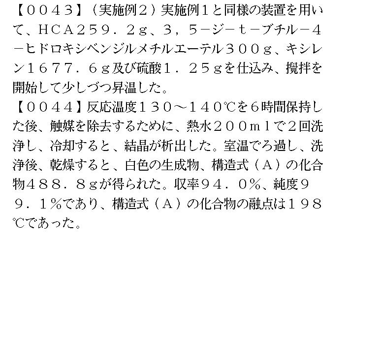 【0043】使用和实施例1相同的装置,放入HCA259.2g,3,5-di-t-butyl-4-hydroxy-benzil-methyl-ether300g,xylene1677.6g以及硫酸1.25g,开始搅拌使其慢慢升温。 【0044】反应温度130-140度保温6小时后,为去除催化剂,使用200ml热水洗净两次,冷却,析出结晶。室温下过滤、洗净、干燥后,得到白色生成物,结构式(A)的化合物488.8g。收率(yield constant)94.0%,纯度99.1%,结构式(A)的化合物的熔点是198度。 |