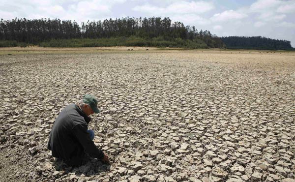 A park ranger examines the dry bed of Lake Penuelas on the outskirts of Valparaiso, Feb 9, 2011. The central and northern regions of Chile are facing one of the worst droughts in recent years, with reservoirs and dams at low levels, producing an increase in food cost due to crop loss and possible rationing of electricity in the near future, according to local media reports.