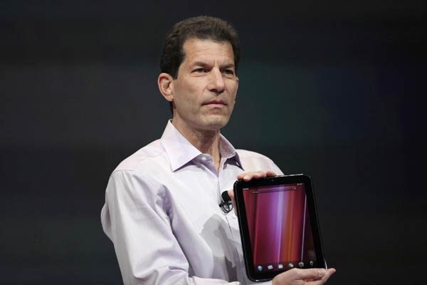 Jon Rubinstein, senior vice president and general manager for Palm, holds the Palm TouchPad during a media presentation at the Herbst Pavilion at the Fort Mason Center in San Francisco Feb 9, 2011.