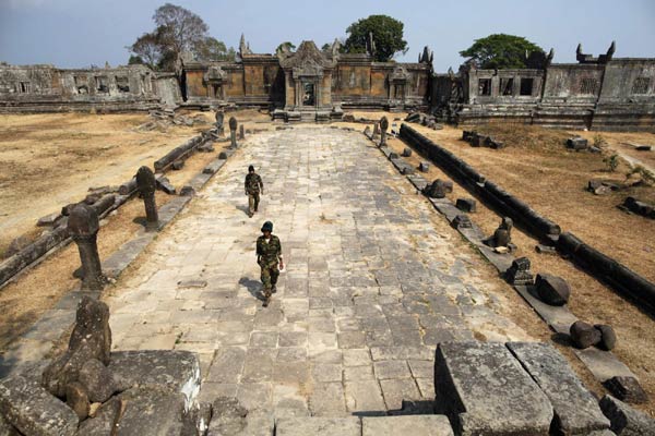 Cambodian soldiers walk at the 11th-century Preah Vihear temple on the border between Thailand and Cambodia Feb 9, 2011. Thailand and Cambodia faced growing diplomatic pressure on Wednesday to end an armed standoff on a stretch of border surrounding the 900-year-old clifftop temple as guns held silent for a second day.