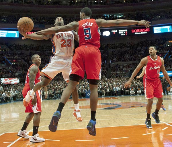 Los Angeles Clippers center DeAndre Jordan (9) fouls New York Knicks guard Toney Douglas (23) in the fourth quarter of their NBA basketball game at Madison Square Garden in New York Feb 9, 2011.
