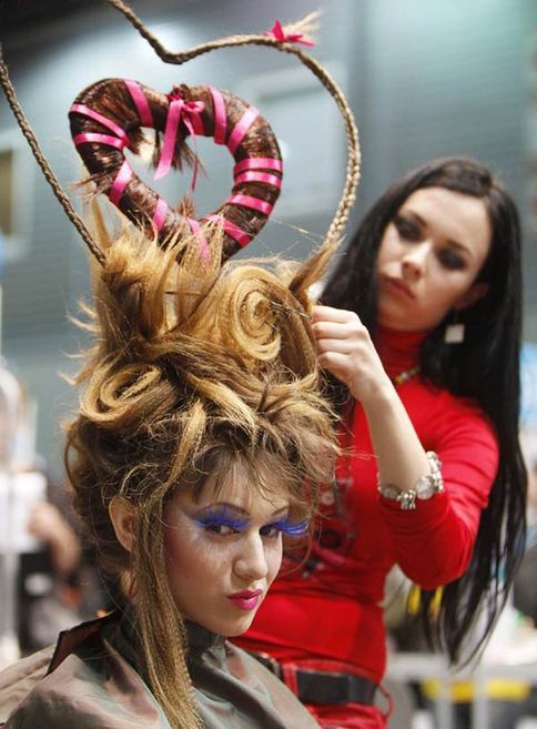 A hairdresser puts the finishing touches to a creation at the "Kiev Cup", a qualifying tournament for the Ukranian championship of hairdressing and make-up in Kiev Feb 9, 2011.