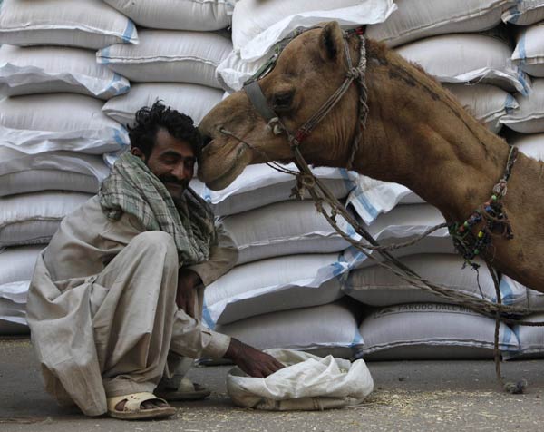 Qasim, a labourer, smiles as a camel nuzzles him near sacks of grain in a wholesale market in Karachi Feb 9, 2011.