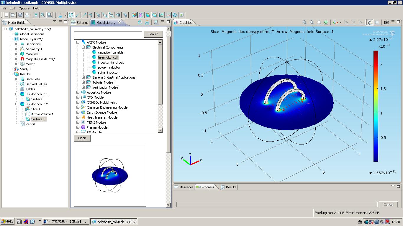 Model library 里的ACDC module , 里面有个Helmholtz Coil ,你应该用的上~ 好好看看就知道了 一般步骤就是画好模型后 定义不同部分的材料, 然后是物理条件~ 根据你电脑的性能设置网格多细~ 最后compute~ 如果想得到磁场最好像model里的一样设置一个工作面~