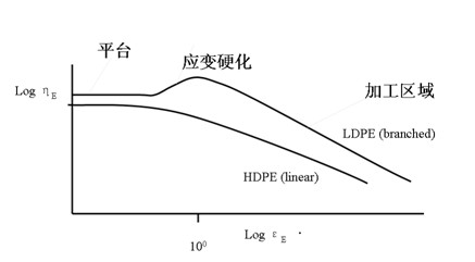 2.下图为LDPE和HDPE拉伸粘度和拉伸应力的关系,简述聚合物支化结构对拉伸粘度影响。