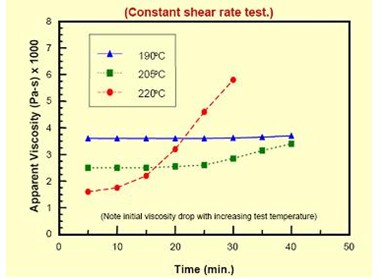 1. 下图为在剪切速率不变时聚氯乙烯(PVC)混炼过程的流变曲线,请说明混炼时间和温度对表观粘度的影响;加工温度太高、混炼时间太长将导致PVC的化学结构产生哪些变化,如何通过流变实验选择合适的加工温度和混炼时间。