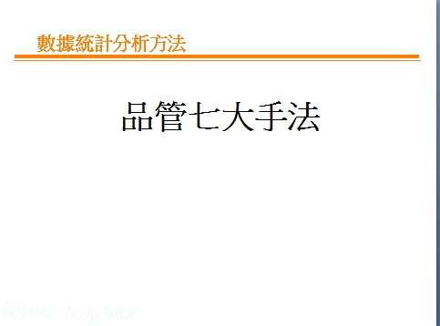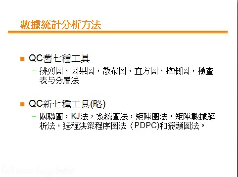 数据统计分析方法-质量管理必备 PPT中对几种方法分别举例说明: QC舊七種工具 排列圖,因果圖,散布圖,直方圖,控制圖,檢查表与分層法 QC新七種工具(略) 關聯圖,KJ法,系統圖法,矩陣圖法,矩陣數據解析法,過程決策程序圖法(PDPC)和箭頭圖法。 [ Last edited by cgdcool on 2011-7-18 at 21:39 ] |