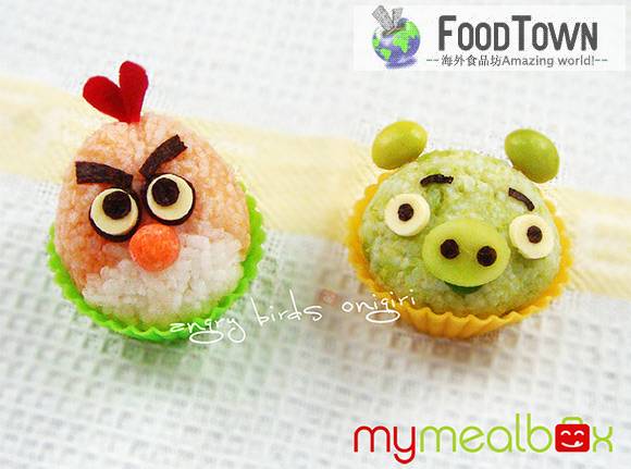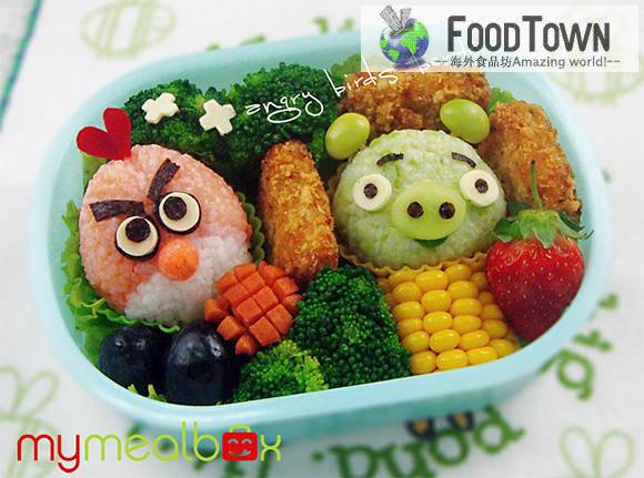 This Angry birds bento is very cute. It was made by the guys at mymealbox. The red bird was made from white rice and tomato sauce, with a carrot beak and red pasta feather. Green piggy was crafted from rice, edamame and pea paste, with good-enough-to-eat edamame ears, and a cucumber nose. Both of them have eyebrows and eyes made from nori and cheese slices http://www.food-town.cn/thread-15781-1-1.html |