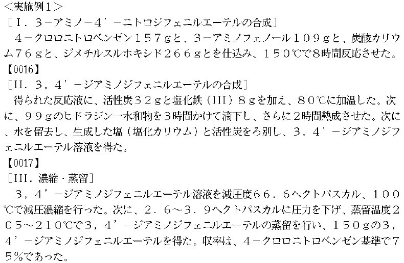 ʵʩÀý1 ¡¾I 3-°±»ù-4'-Ïõ»ù¶þ±½ÃÑ£¨3-amino-4'-nitrodiphenyl ether £©µÄºÏ³É ×°Èë¶ÔÏõ»ùÂȱ½£¨4-chloronitrobenzene£© 1.57g ,109g ¼ä°±»ù±½·Ó£¨3-aminophenol )£¬76g̼Ëá¼Ø£¬226g ¶þ¼×»ùÑÇí¿£¨dimethyl sulfoxide£© ,150¶ÈÏ·´Ó¦8¸öСʱ ¡¾0016¡¿ [II£¬3,4'-¶þ°±»ù¶þ±½ÃÑ£¨3£¬4¡¯-diaminodiphenyl ether£©µÄºÏ³É] ÔÚ·´Ó¦µÃµ½µÄ·´Ó¦ÒºÄÚ£¬¼ÓÈë32g»îÐÔÌ¿ºÍ8g ÂÈ»¯Ìú(III), 80¶ÈϼÓÈÈ£¬ È»ºóÓÃ3СʱµÎ¶¨99gµÄË®ºÏ루hydrazine *H2O £©£¬ÔÙ¼ÓÈÈ2Сʱ¡£È»ºóÕôȥˮ£¬¹ýÂËÉú³ÉµÄÑΣ¨ÂÈ»¯¼Ø£©ºÍ»îÐÔÌ¿£¬µÃµ½3,4'-¶þ°±»ù¶þ±½ÃÑ(3£¬4¡¯-diaminodiphenyl ether)ÈÜÒº¡£ ¡¾0017¡¿ [III ŨËõ£¬ÕôÁó] 66.6 hPa£¬100¶ÈÏ ¼õѹŨËõ 3,4'-¶þ°±»ù¶þ±½ÃÑ(3,4'-diaminodiphenyl ether)£¬½Ó×Å£¬½µµ½2.6-3.9 hPa ζȶ¨ÔÚ205-210¶ÈÕôÁó3,4'-¶þ°±»ù¶þ±½ÃÑ(3,4'-diaminodiphenyl ether)£¬µÃµ½150gµÄ3,4'-¶þ°±»ù¶þ±½ÃÑ(3,4'-diaminodiphenyl ether) £¬ÊÕÂÊÒÔ¶ÔÏõ»ùÂȱ½(4-chloronitrobenzene)Ϊ»ù×¼ 75% |