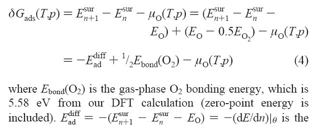 按照这篇文章的背景来看,所有第一性原理相关的量都是0K,0Pa下的。所以我觉得你说的gas phase O2 bongding energy 就是这样的。 我觉得这里实际上有两层问题: 第一,0K 0Pa下O2的成键能,一个10A的Box里面放一个O2,Gamma点算出自由能F1,10A的Box里面放一个O原子,Gamma点算出自由能F2,键能E=F1-2F2。如果要考虑零点能,那么O2的F1和O原子的F2都要考虑零点能修正。由于O2成键作用的存在,它的零点能可能与单个O原子零点能的二倍小不少,所以作者没有忽略。 第二,成键能为什么不考虑(或者忽略)温度的影响,而直接用第一中的能量差呢?成键可以写成2O->O2。作者没有办法在物理化学手册上查到O原子的实验热力学量可能是原因之一。 |