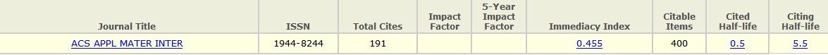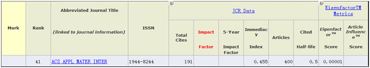 2009年新创刊的ACS Applied Materials & Interfaces《美国化学会应用材料与界面》,ISSN: 1944-8244,月刊,美国化学学会(AMER CHEMICAL SOC, 1155 16TH ST, NW, WASHINGTON, USA, DC, 20036)出版,2009年入选 Web of Science的Science Citation Index和Science Citation Index Expanded,目前在SCI数据库可以检索到该期刊2009年的第1卷到2009年的第8卷共253篇论文。 253篇论文的主要国家分布:美国108篇、中国30篇、日本26篇、德国15篇、加拿大14篇、印度12篇、韩国11篇、英国10篇。 中国在ACS Applied Materials & Interfaces上发文的主要单位为中国科学院(CHINESE ACAD SCI)6篇、哈尔滨工业大学(HARBIN INST TECHNOL)3篇、武汉大学(WUHAN UNIV)3篇、清华大学(TSINGHUA UNIV)2篇、浙江大学(ZHEJIANG UNIV)2篇。 253篇论文已经被引用来89次,平均引用0.35次,H指数为4(有4篇文章每篇最少被引用4次)。 253篇论文被引用最多为美国克拉克森大学(Clarkson Univ)Minko, S (通讯作者)在《ACS Applied Materials & Interfaces 》2009年第1卷第1期上发表的“Bioelectrocatalytic System Coupled with Enzyme-Based Biocomputing Ensembles Performing Boolean Logic Operations: Approaching "Smart" Physiologically Controlled Biointerfaces”论文,被引用9次。 中国学者为第一作者单位在ACS Applied Materials & Interfaces 期刊发表论文引用最多的为中国科学院(Chinese Acad Sci, Lanzhou Inst Chem Phys, State Key Lab Solid Lubricat,)在《ACS Applied Materials & Interfaces 》2009年第1卷第2期上发表的“Bisimidazolium Ionic Liquids as the High-Performance Antiwear Additives in Poly(ethylene glycol) for Steel-Steel Contacts”论文,被引用3次。 |