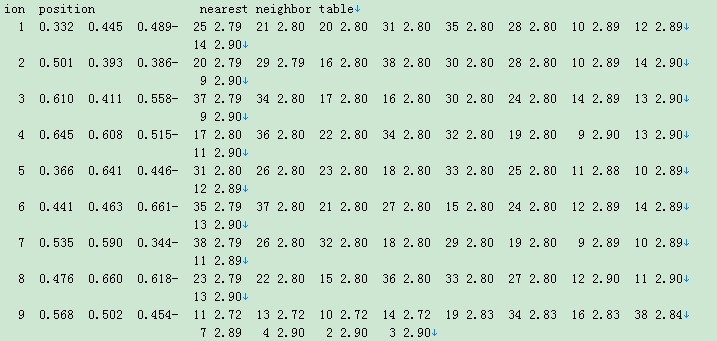 请问会用FORTRAN写程序的高手:比如我有5个原子的图形坐标和最近邻距离的表格如下 1 # # # 2¥ 3¥ 4¥ 5¥ 2 # # # 1¥ 3¥ 4¥ 5¥ 3 # # # 1¥ 2¥ 4¥ 5¥ 4 # # # 1¥ 2¥ 3¥ 5¥ 5 # # # 1¥ 2¥ 3¥ 4¥ #代表原子坐标,¥代表原子与最近邻原子的距离(这里的最近邻我写的是除了本身所有的,当然也有情况最近邻并不是除了本身剩余的原子)请问我如何通过程序实现平均最近邻距离的计算?? 我想要的是平均距离,也就是所有的¥加和平均。 我这举得是5个的,也可以手动实现,但是我想处理的是60 70 80 诸如这种的,这样的话最近邻可能就得是几百个数,请问如何实现? 实例如下(原格式如第二三行,下面的在复制粘贴时出现了换行,15-38是正常的格式) ion position nearest neighbor table 1 0.332 0.445 0.489- 25 2.79 21 2.80 20 2.80 31 2.80 35 2.80 28 2.80 10 2.89 12 2.89 14 2.90 2 0.501 0.393 0.386- 20 2.79 29 2.79 16 2.80 38 2.80 30 2.80 28 2.80 10 2.89 14 2.90 9 2.90 3 0.610 0.411 0.558- 37 2.79 34 2.80 17 2.80 16 2.80 30 2.80 24 2.80 14 2.89 13 2.90 9 2.90 4 0.645 0.608 0.515- 17 2.80 36 2.80 22 2.80 34 2.80 32 2.80 19 2.80 9 2.90 13 2.90 11 2.90 5 0.366 0.641 0.446- 31 2.80 26 2.80 23 2.80 18 2.80 33 2.80 25 2.80 11 2.88 10 2.89 12 2.89 6 0.441 0.463 0.661- 35 2.79 37 2.80 21 2.80 27 2.80 15 2.80 24 2.80 12 2.89 14 2.89 13 2.90 7 0.535 0.590 0.344- 38 2.79 26 2.80 32 2.80 18 2.80 29 2.80 19 2.80 9 2.89 10 2.89 11 2.89 8 0.476 0.660 0.618- 23 2.79 22 2.80 15 2.80 36 2.80 33 2.80 27 2.80 12 2.90 11 2.90 13 2.90 9 0.568 0.502 0.454- 11 2.72 13 2.72 10 2.72 14 2.72 19 2.83 34 2.83 16 2.83 38 2.84 7 2.89 4 2.90 2 2.90 3 2.90 10 0.437 0.518 0.421- 9 2.72 11 2.72 14 2.72 12 2.73 26 2.83 28 2.83 29 2.83 25 2.84 1 2.89 2 2.89 5 2.89 7 2.89 11 0.504 0.619 0.482- 9 2.72 12 2.72 13 2.72 10 2.72 22 2.83 32 2.83 18 2.83 33 2.83 5 2.88 7 2.89 8 2.90 4 2.90 12 0.409 0.551 0.551- 13 2.72 11 2.72 14 2.72 10 2.73 27 2.83 21 2.83 23 2.83 31 2.83 1 2.89 5 2.89 6 2.89 8 2.90 13 0.540 0.535 0.583- 14 2.72 12 2.72 9 2.72 11 2.72 15 2.83 17 2.83 37 2.83 36 2.83 4 2.90 3 2.90 8 2.90 6 2.90 14 0.472 0.434 0.522- 13 2.72 10 2.72 9 2.72 12 2.72 24 2.83 30 2.83 20 2.83 35 2.83 3 2.89 6 2.89 2 2.90 1 2.90 15 0.512 0.569 0.717- 27 2.79 36 2.79 37 2.79 8 2.80 6 2.80 13 2.83 16 0.635 0.381 0.424- 34 2.79 38 2.80 30 2.80 2 2.80 3 2.80 9 2.83 17 0.676 0.519 0.618- 34 2.79 36 2.80 37 2.80 4 2.80 3 2.80 13 2.83 18 0.468 0.708 0.378- 33 2.79 32 2.80 26 2.80 5 2.80 7 2.80 11 2.83 19 0.668 0.571 0.382- 32 2.79 34 2.79 38 2.79 7 2.80 4 2.80 9 2.83 20 0.402 0.328 0.460- 35 2.79 28 2.79 2 2.79 30 2.80 1 2.80 14 2.83 21 0.308 0.481 0.622- 27 2.79 31 2.79 35 2.80 1 2.80 6 2.80 12 2.83 22 0.574 0.725 0.544- 36 2.79 32 2.79 33 2.80 8 2.80 4 2.80 11 2.83 23 0.341 0.672 0.581- 31 2.79 8 2.79 33 2.79 27 2.80 5 2.80 12 2.83 24 0.508 0.344 0.626- 30 2.79 35 2.80 37 2.80 3 2.80 6 2.80 14 2.83 25 0.300 0.534 0.386- 26 2.79 1 2.79 28 2.79 31 2.80 5 2.80 10 2.84 26 0.399 0.604 0.316- 25 2.79 29 2.79 7 2.80 18 2.80 5 2.80 10 2.83 27 0.378 0.585 0.684- 15 2.79 21 2.79 23 2.80 6 2.80 8 2.80 12 2.83 28 0.365 0.414 0.357- 29 2.79 20 2.79 25 2.79 2 2.80 1 2.80 10 2.83 29 0.464 0.484 0.287- 28 2.79 26 2.79 38 2.79 2 2.79 7 2.80 10 2.83 30 0.537 0.311 0.494- 24 2.79 16 2.80 20 2.80 2 2.80 3 2.80 14 2.83 31 0.272 0.568 0.518- 23 2.79 21 2.79 5 2.80 25 2.80 1 2.80 12 2.83 32 0.603 0.692 0.411- 19 2.79 22 2.79 18 2.80 7 2.80 4 2.80 11 2.83 33 0.440 0.742 0.510- 23 2.79 18 2.79 22 2.80 5 2.80 8 2.80 11 2.83 34 0.705 0.485 0.486- 16 2.79 19 2.79 17 2.79 3 2.80 4 2.80 9 2.83 35 0.373 0.361 0.593- 20 2.79 6 2.79 21 2.80 24 2.80 1 2.80 14 2.83 36 0.611 0.639 0.647- 22 2.79 15 2.79 17 2.80 4 2.80 8 2.80 13 2.83 37 0.577 0.449 0.688- 3 2.79 15 2.79 17 2.80 24 2.80 6 2.80 13 2.83 38 0.599 0.468 0.320- 7 2.79 29 2.79 19 2.79 16 2.80 2 2.80 9 2.84 [ Last edited by 阿黛拉 on 2011-2-22 at 09:10 ] |