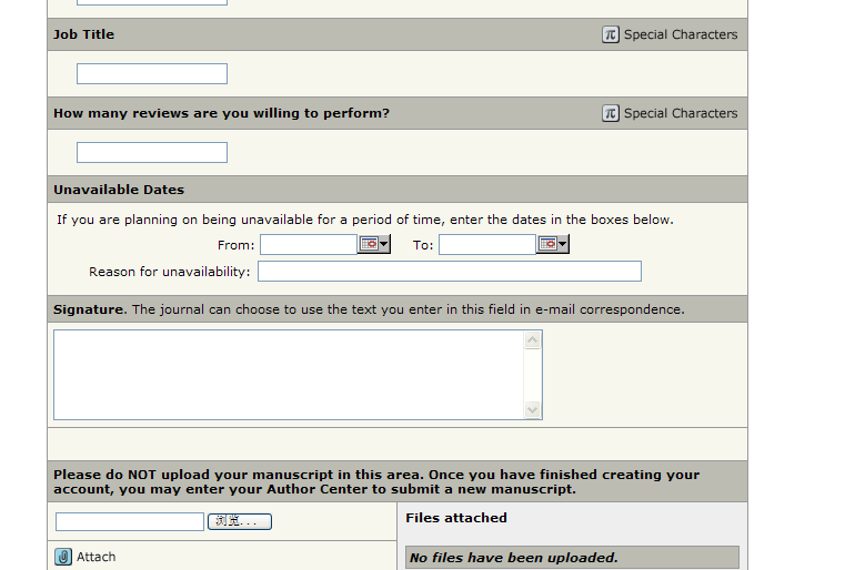 ,How many reviews are you willing to perform?,Unavailable Dates (If you are planning on being unavailable for a period of time, enter the dates in the boxes below),Signature. (The journal can choose to use the text you enter in this field in e-mail correspondence.)请问这些该怎么填?期待大家的解答!