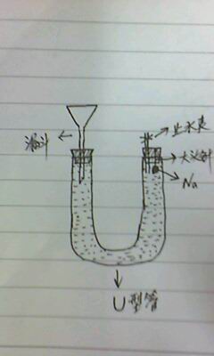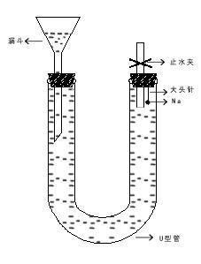 仪器有:U型管(充满水),漏斗,橡皮塞(2个),止水夹,大头针,金属钠。