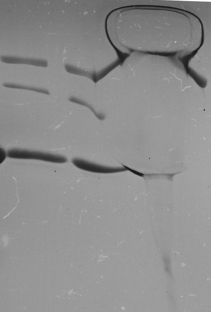 不知道是PEG还是TX100形成了大分子团,影响了电泳,又是大团,又是拖尾的。去垢剂浓度太高会影响电泳