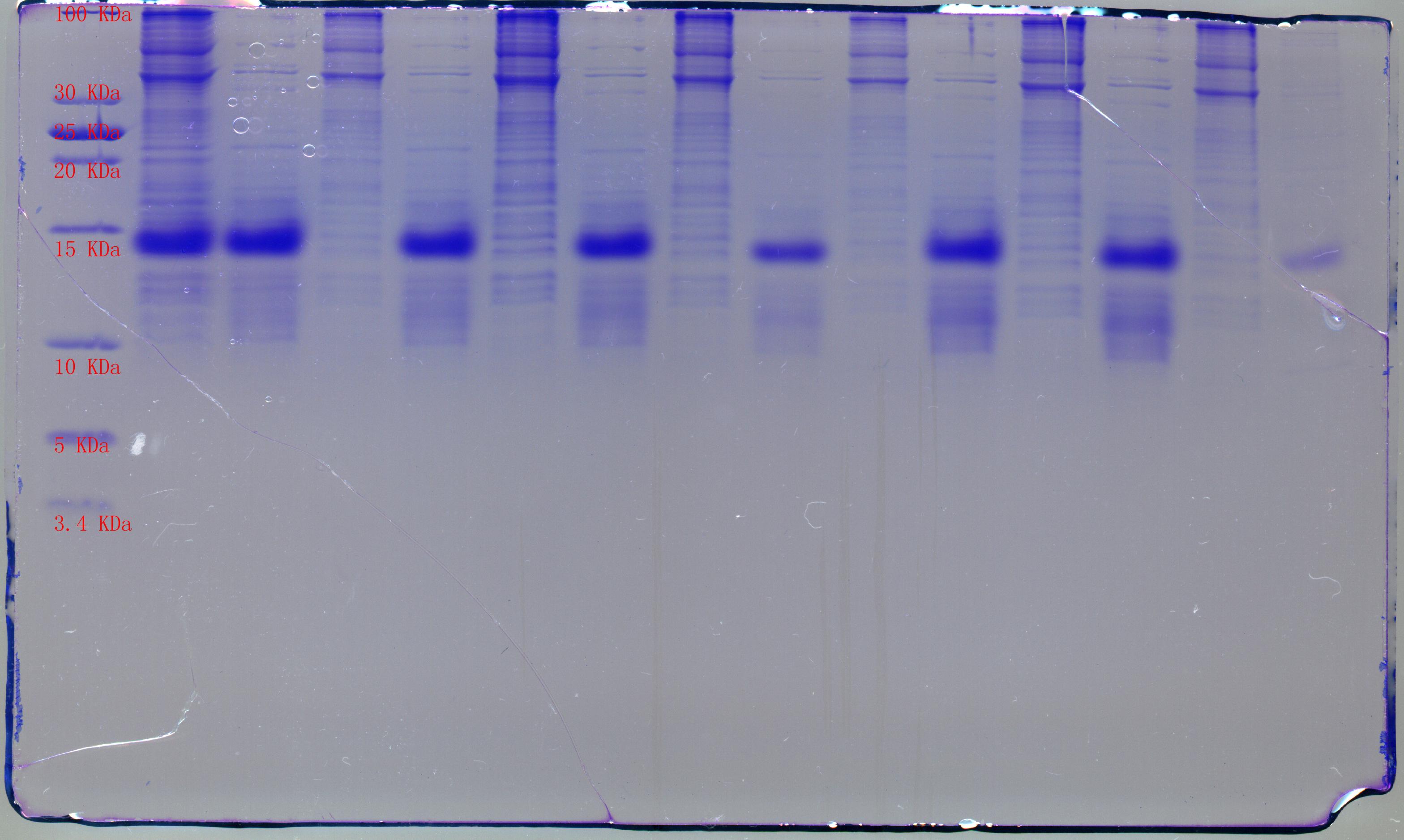 各位大侠: 如果自己的蛋白样品不是很纯,还有较多的杂蛋白,要做凝胶过滤,是不是对凝胶过滤柱子很不好?为什么? 目的蛋白纯净到什么程度才可以做凝胶过滤?怎么在蛋白胶上判断?有没有什么标准? 附件有一张我的蛋白胶图,可以上凝胶柱子做纯化了吗? 谢谢各位了! |